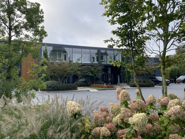 Voor de buitenruimte in en om het gebouw mochten we een ontwerp maken met kunstgras, cortenstalen bakken met meerstammige heesters, twee zwembadjes met daarom heen een rand van Zweeds graniet gemetseld.